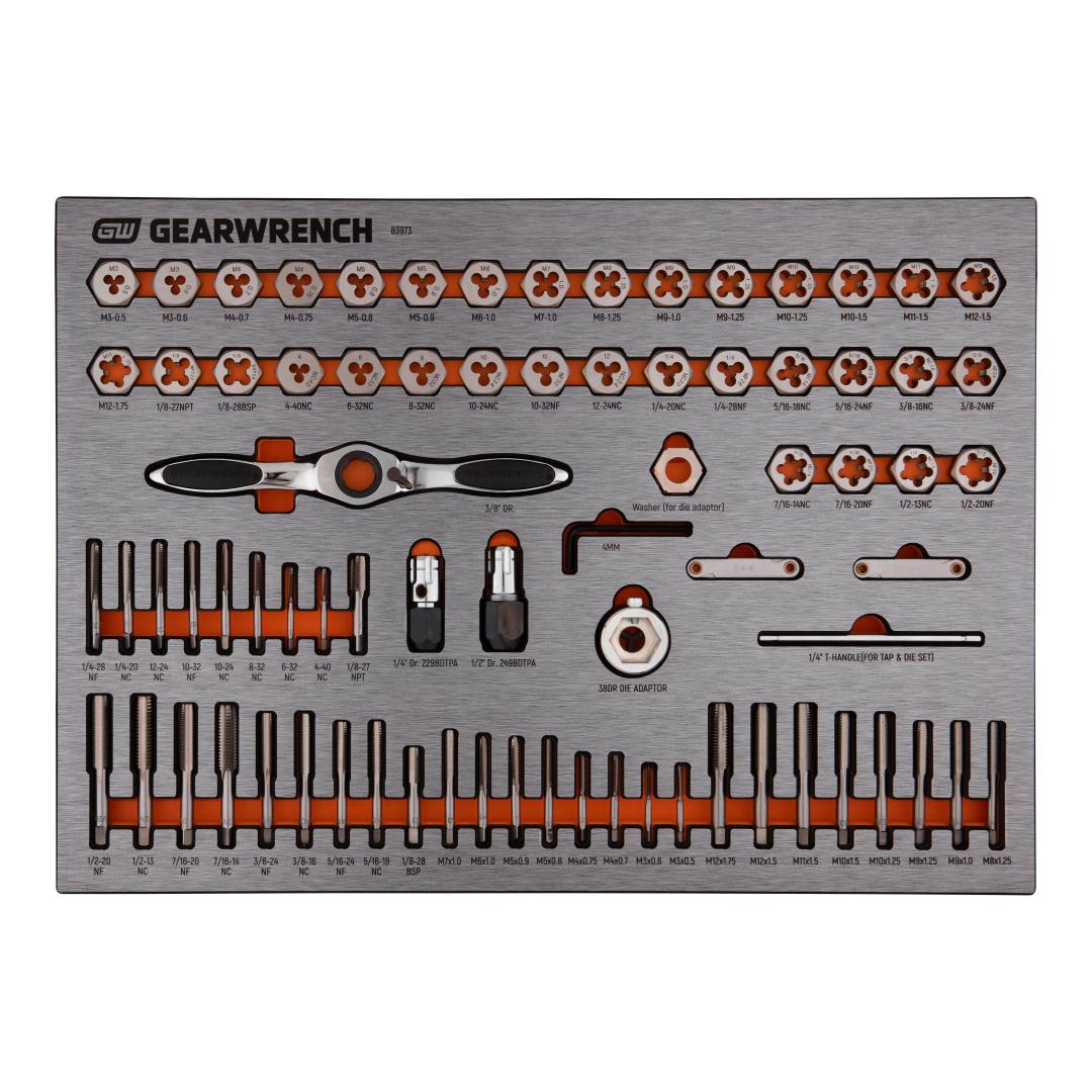 GEARWRENCH mechanics tools have been designed with professional users in mind for better productivity, access, and strength. The 77 Piece Tap & Die SAE/Metric EVA Tray Set is one of a wide collection of Modular Sets we offer that feature premium quality tools organised in sturdy foam storage trays. These chemical and solvent resistant foam trays are designed to fit in a wide range of tool storage systems, including our line of storage products. Each tool fits in a custom cutout that provides optimal protection, organisation, and accessibility.